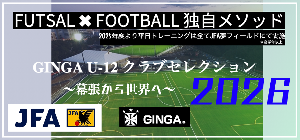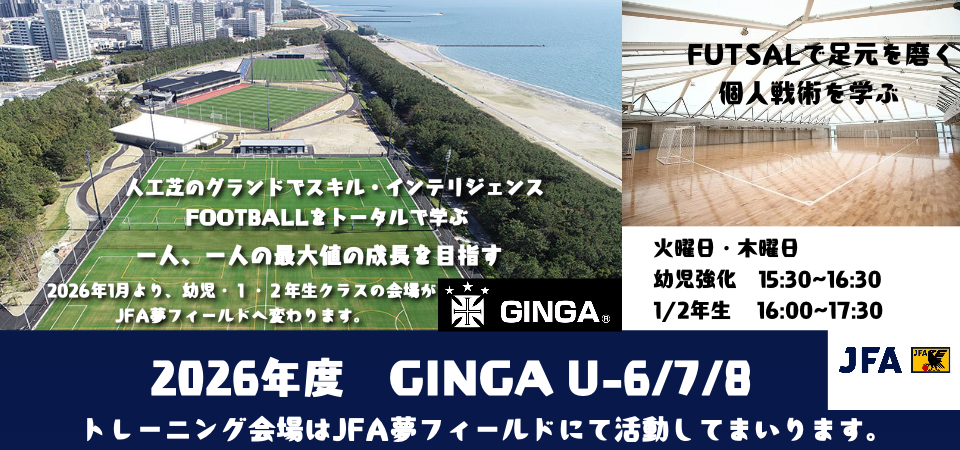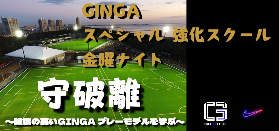 【世界基準】をテーマに、海外でプレー経験があるスタッフを中心にクラブ独自のトレーニングメソッドにて育成を行っております。サッカー・フットサル・ビーチサッカーができる環境である千葉市美浜区を活動拠点とし、世界で活躍する【個】を育てる事でも有名なブラジル サントスFCのようなクラブモデルを目指しています。クラブ名でもある【GINGA】とは、ブラジルのサッカー用語でテクニックがある選手・上手い選手【クラッキ】へ使われます。GINGA F.C. では、GINGAを持った選手の育成に力を入れております。